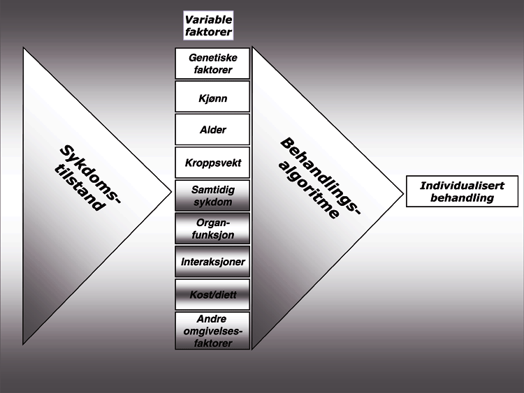 I dette kapitlet gis det i første rekke noen eksempler på hvordan genetiske faktorer og pasientens kjønn kan innvirke på utfallet av legemiddelterapi, mens betydningen av alder, endringer i organfunksjon og legemiddelinteraksjonspotensial som hører inn i det helhetlige bildet, er behandlet i øvrige kapitler (se nedenfor). Innenfor flere terapiområder sees implementering av behandling basert på kunnskap om hvilke variable faktorer som har en reell innvirkning på effekt og toksisitet både av enkeltlegemidler og kombinerte regimer. En slik ambisjon innebærer betydelige utfordringer for medisinsk forskning og utviklingsarbeid, og ikke minst for å kunne omsette et komplekst kunnskapsmateriale til evidensbasert beslutningsstøtte og anvendbare retningslinjer og rutiner til bruk i en klinisk hverdag.
