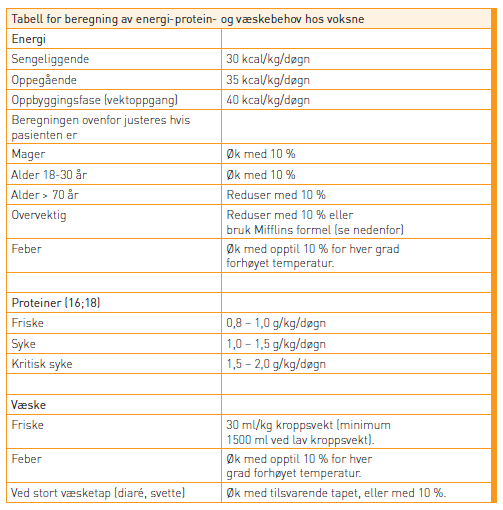 Tabellen nedenfor, hentet med tillatelse fra Kosthåndboken (2016, Helsedirektoratet), er en generell beregning av energi, protein og væskebehov hos voksne.